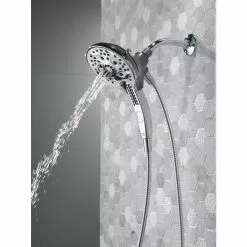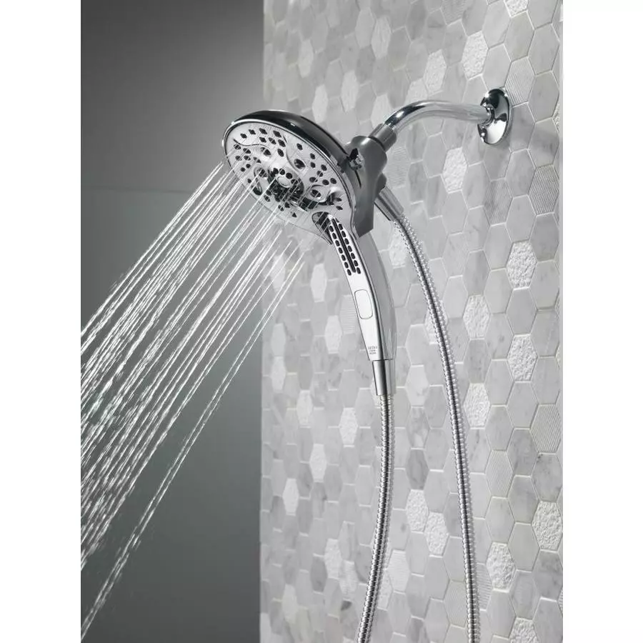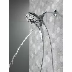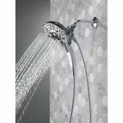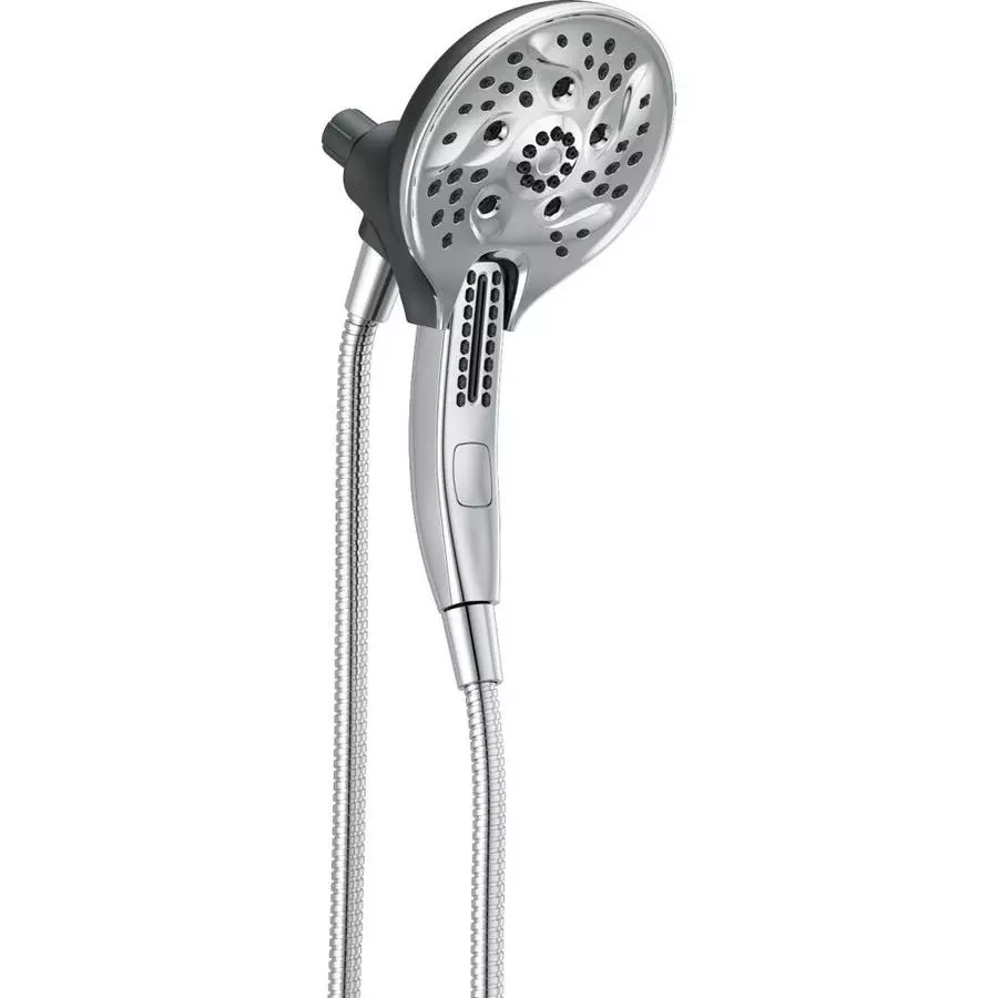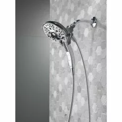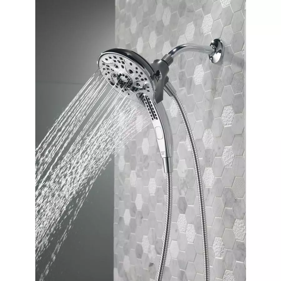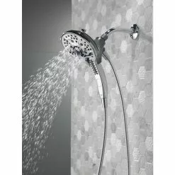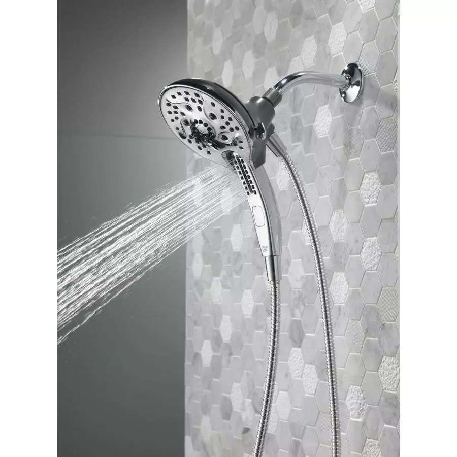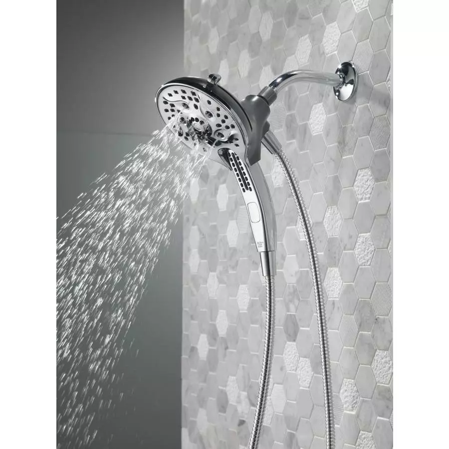 The Delta In2ition 2-in-1 hand shower features a built-in shower head that lets you spray water exactly where you want it. The handheld shower and shower head can be used simultaneously for excellent versatility. Use it to rinse your hair, bathe small children and pets, or even for rinsing your tub. H2Okinetic shower technology sculpts water into a unique pattern, forming a powerful spray that lets you feel like you are enjoying more water without consuming more. Its MagnaTite docking station features a strong built-in magnet that holds the showerhead in place for easy docking after each use.