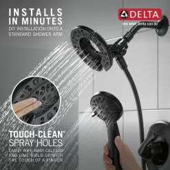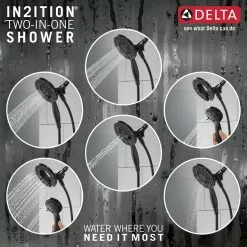The Delta In2ition Two-in-One Shower features a detachable hand shower which can be used separately from or simultaneously with the shower head. This integrated dual-functionality gives you maximum flexibility without sacrificing warmth, as you can choose to have water streaming from the shower head only, the hand shower only or both the shower head and hand shower at once. While other products may gather unsightly mineral build-up over time, Delta soft rubber Touch-Clean spray holes allow any mineral residue to simply be wiped away for an instantly refreshed look with no need for soaking or the aid of chemical cleaners. The pause setting gives you ample space for shaving, lathering and other shower tasks, then easily restarts the water with the temperature where you left off. This spray setting helps you conserve water, so you can worry less about depleting your supply of hot water – and you help the environment too. Delta pressure-balance valves use Monitor Technology to protect you and your family from sudden temperature changes. Delta WaterSense labelled faucets, showers and toilets use at least 20% less water than the industry standard saving you money without compromising performance.