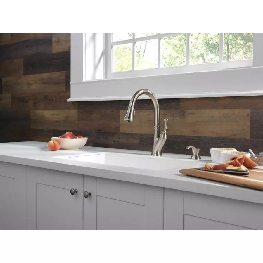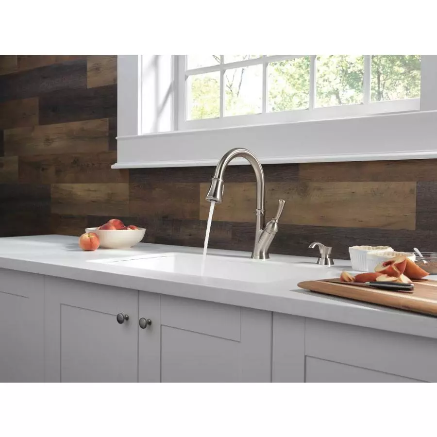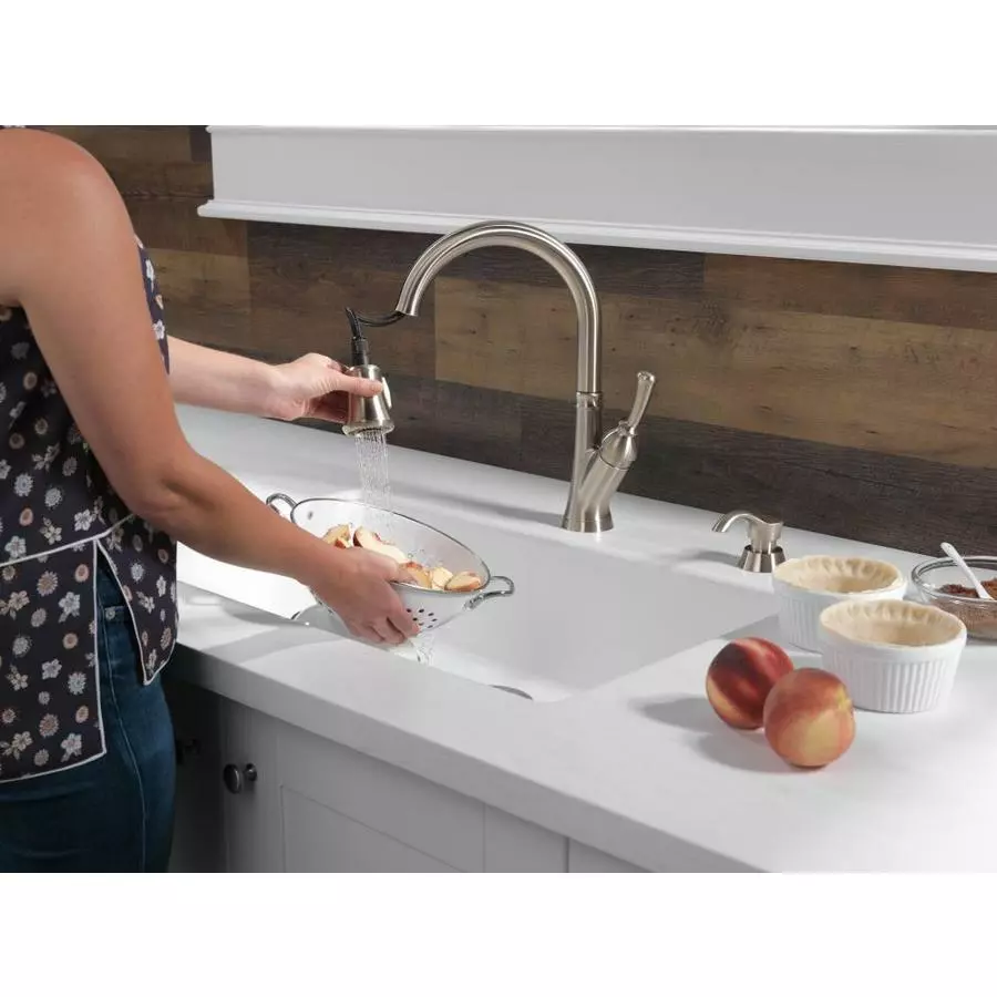 This faucet by Delta features ShieldSpray technology that cleans with laser-like precision while containing mess and splatter. The concentrated jet powers away stubborn messes while an innovative shield of water contains splatter and clears off the mess, so you can spend less time soaking, scrubbing and shirt swapping. The MagnaTite docking uses a powerful integrated magnet to pull your faucet spray wand precisely into place and hold it there so it stays docked when not in use. The Seal Technology reduces leak points, is less hassle to install and lasts twice as long as the industry standard. This product is backed by a limited lifetime warranty.