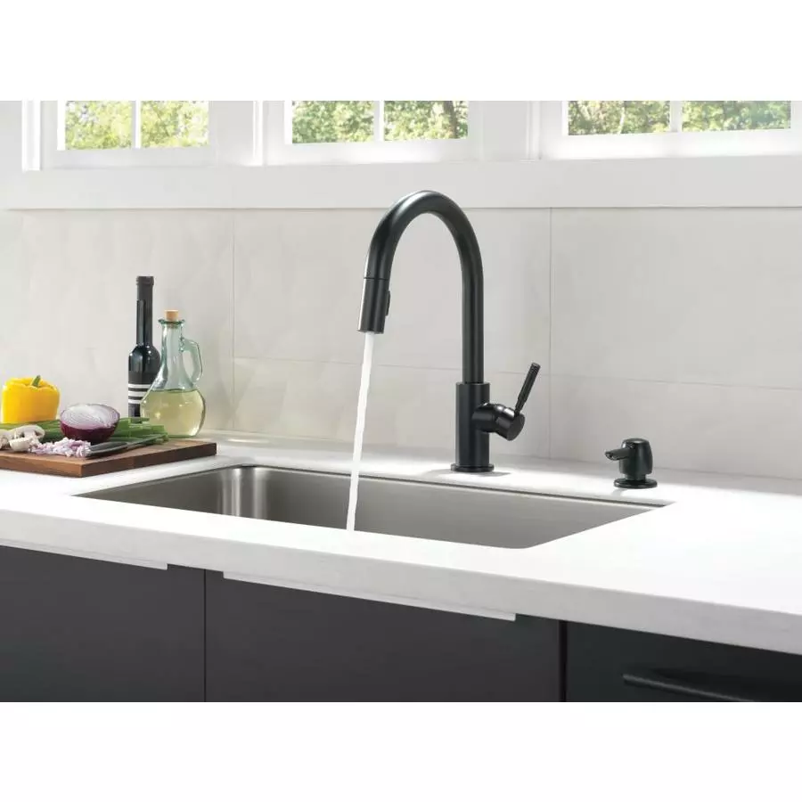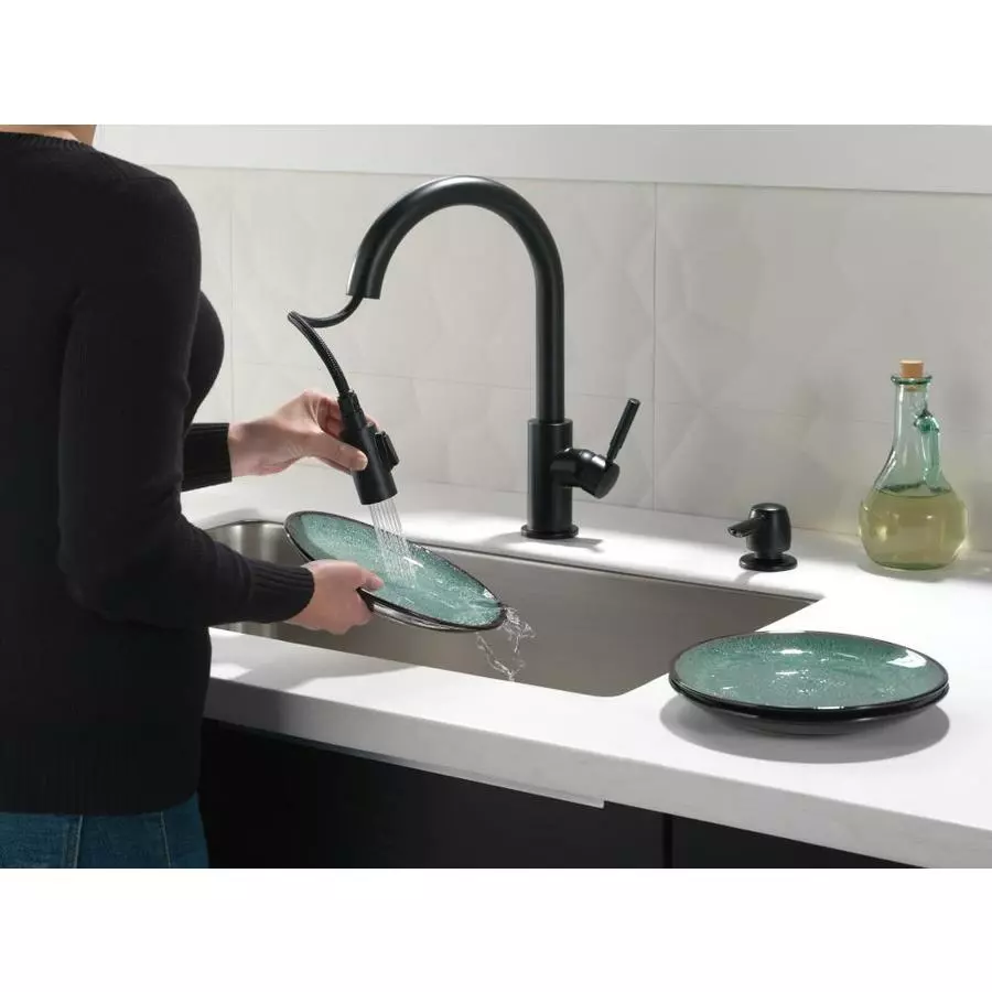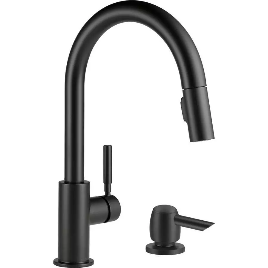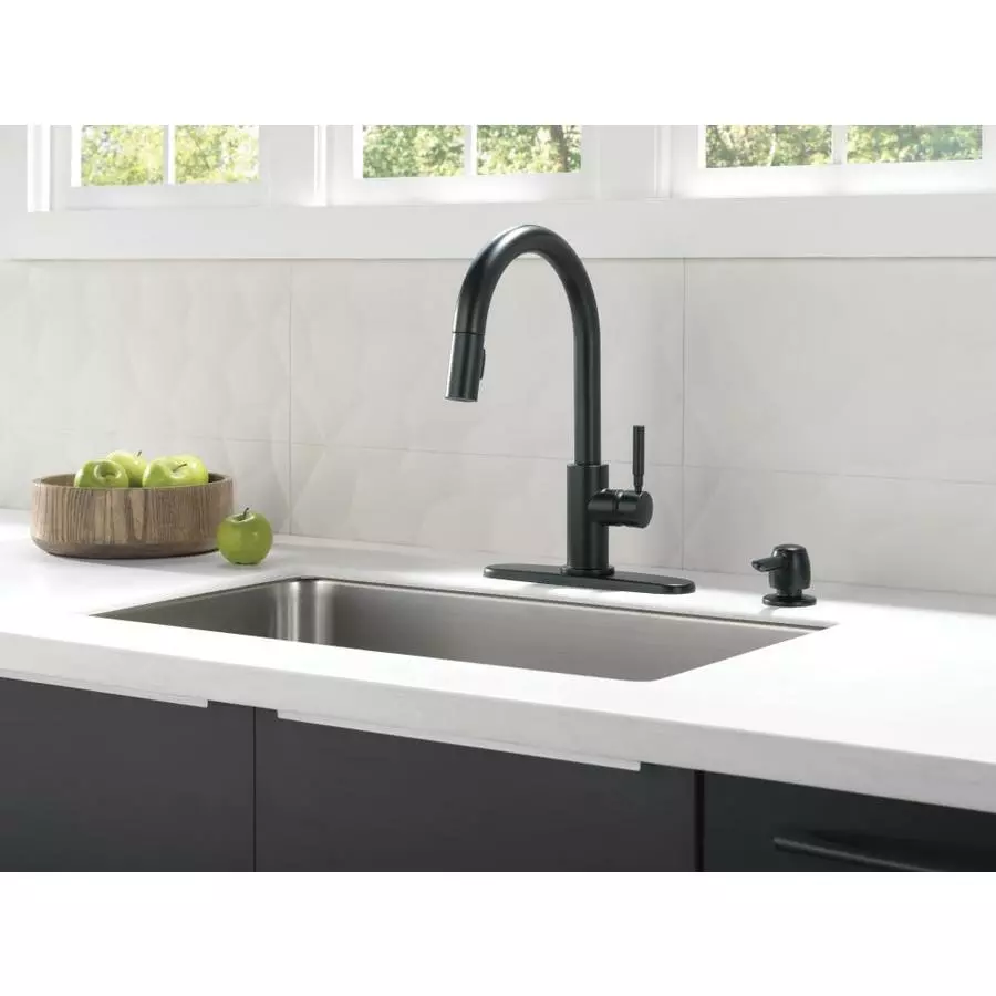 Delta Trask matte black kitchen faucet offers a sleek sophistication in the kitchen for both style and functionality. The pull-down spray wand comes free with a gentle tug and gives you total flexibility. The hose extends and retracts without friction points, fed by gravity. As you raise the wand to dock it, the magnet embedded in the spout pulls the wand precisely into place. So, unlike other pull-downs that tend to droop over time, MagnaTite(R) docking system keeps your pull-down faucet looking picture-perfect. Delta’s exclusive DIAMOND Seal(R) Technology uses a valve with a tough diamond coating. InnoFlex(R) PEX waterways keep water inside the faucet out of contact with potential metal contaminants. This powerful combination brings you a faucet built to last up to five million uses.