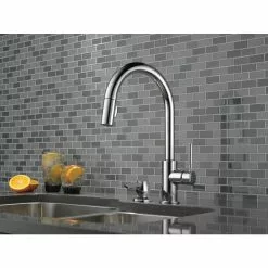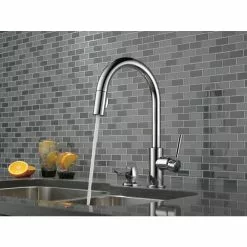 The Trask kitchen faucet offers a sleek conception for a sophisticated look in the kitchen both in terms of style and functionality. The pull-down spray wand comes free with a gentle tug and gives you total flexibility. The hose extends and retracts without friction points, fed by gravity. As you raise the wand to dock it, the magnet embedded in the spout pulls the wand precisely into place. So, unlike other pull-downs that tend to droop over time, MagnaTite keeps your pull-down faucet looking picture-perfect. Delta’s exclusive DIAMOND Seal Technology uses a valve with a tough diamond coating. InnoFlex PEX waterways keep water inside the faucet out of contact with potential metal contaminants. This powerful combination brings you a faucet built to last up to five million uses. Only Delta faucets are equipped with Touch-Clean soft, rubber nubbins that allow you to easily wipe away calcium and lime build-up with the touch of a finger.